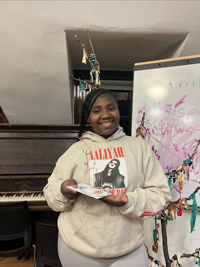An 8th grade student at the Homewood branch of the Allegheny Public Library in Pittsburgh, Jakira takes classes with ProjectArt Resident Teaching Artist Avery McGrail. When she first joined, she was a bit shy, but quickly found her footing through her thoughtful listening, curiosity, and willingness to jump right into each project.